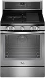 Whirlpool Stainless Steel Freestanding Gas Range WFG720H0AS. Achieve uniform baking results every time with the AccuBake temperature management system. A built-in sensor monitors oven temperature and controls the cooking elements to deliver consistent, delicious results every time. Seal in flavor and juices with the TimeSavor Plus true convection cooking system. A rear fan and a third heating element in the back of the oven circulate hot air over, under and around food to bake quicker than an oven without true convection. TimeSavor Plus true convection cooking roasts 30% faster. Our most energy-efficient cleaning cycle uses water and low-heat to release baked-on foods from the bottom of the oven. When the cleaning cycle is complete, soils and excess water can be easily removed with a dry towel. Rapid Preheat uses all of the elements and a rear fan to heat the oven quickly and efficiently. Now you can save time when single-rack baking with 25% faster preheating. Cook multiple dishes for a large family meal or prepare treats for a bake sale with Whirlpool brand's 5.8 cu. ft. capacity gas ranges. Keep the heat inside your oven while checking on dishes through the industry's largest window. Now you can keep a close eye on cooking progress without opening the door or disturbing oven temperature with the EasyView extra-large oven window. Generate the high heat needed for rapid boiling, searing and frying with burners that offer 15,000 or 17,000 BTUs. Delivers precise temperature control that is perfect for melting chocolate or simmering sauces. Take advantage of this oven's flexible cooking capacity with the split rack. This rack can be removed to make room for large or tall items like a turkey and reattached to make a full rack. Use faster convection cooking with all of your favorite recipes. The convection conversion feature automatically adjusts the oven temperature, taking the guesswork out of programming your oven. This large griddle offers you more cooking area and